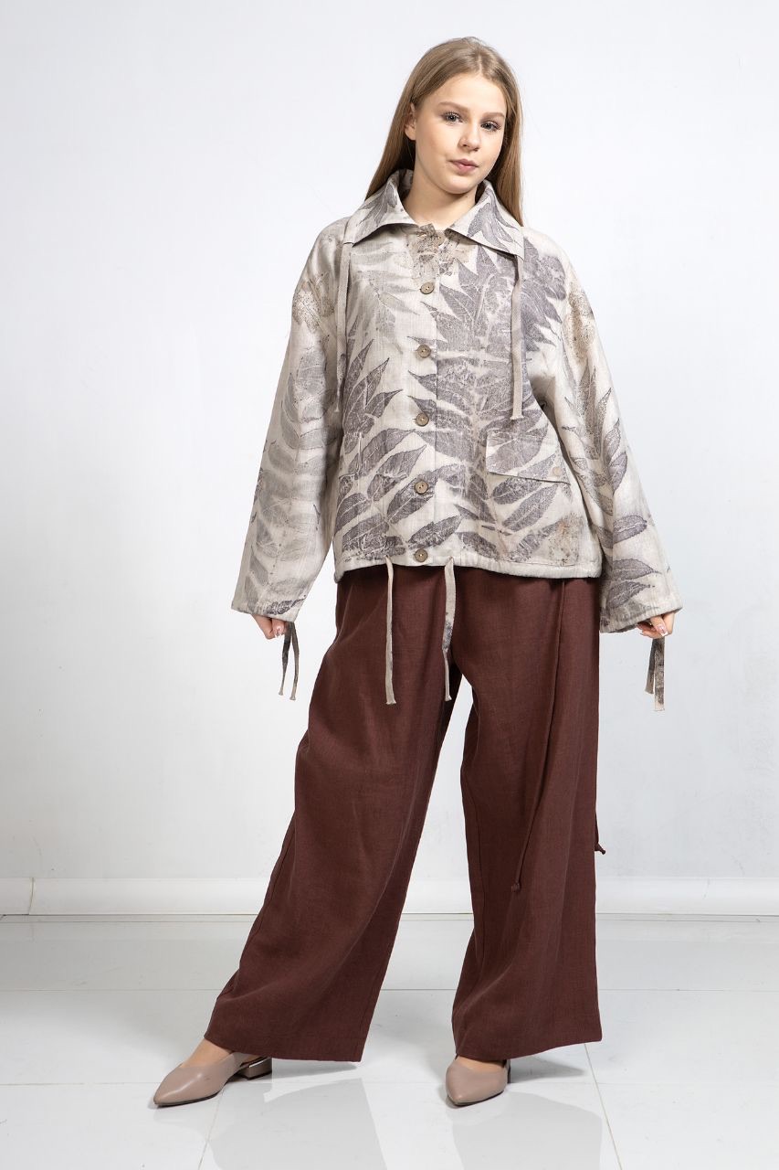Здесь нет конвейера. Только ручная работа, многослойная и вдумчивая. Сначала ткань расписывают в технике батика — той самой, где краски ложатся мягкими переливами, создавая эффект акварели. Затем добавляют роспись, набойку, вышивку, экопринт. В результате на кофтах и платьях расцветают маки, ирисы, орхидеи, лотосы, появляются листья и даже диковинные деревья. Это не просто принты — это целые истории, запечатлённые на льне.