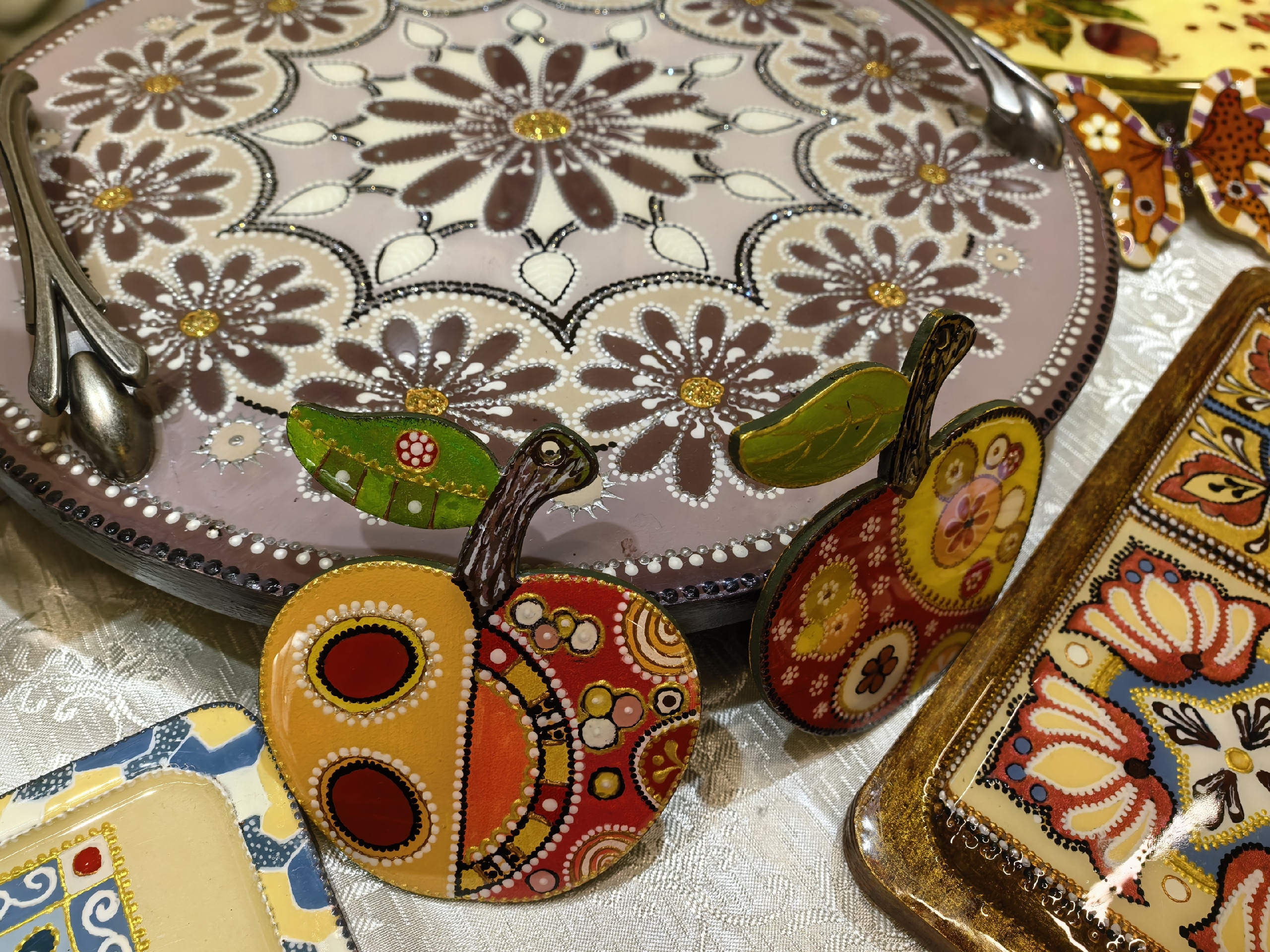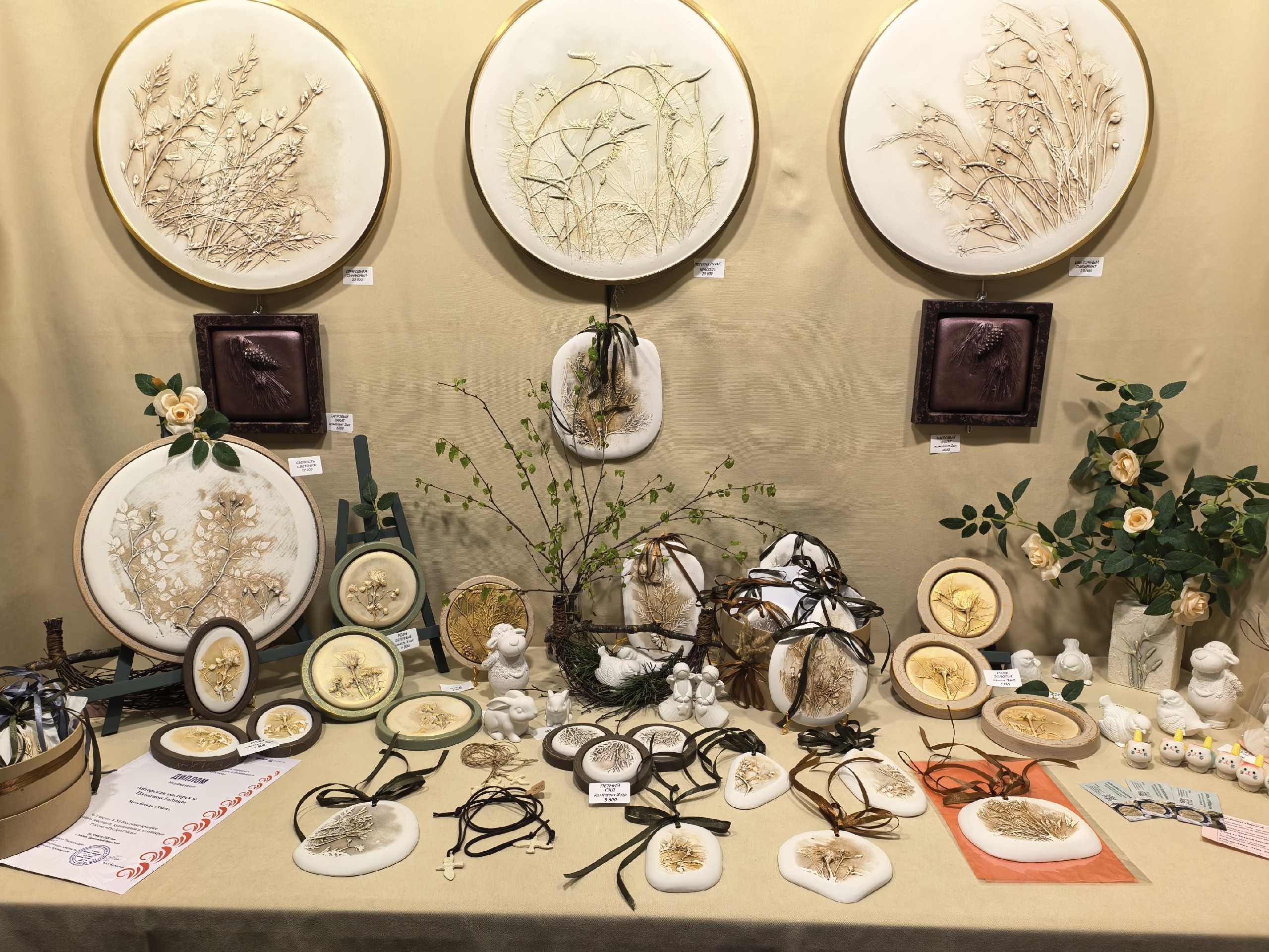 Керамика и фарфор, ювелирные изделия, эмальерное искусство, стекло, металл, кожа, кружево, вышивка, пух и войлок, резьба и роспись по дереву, живопись, авторские украшения, художественные куклы — здесь можно увидеть всё богатство российского декоративно-прикладного искусства.