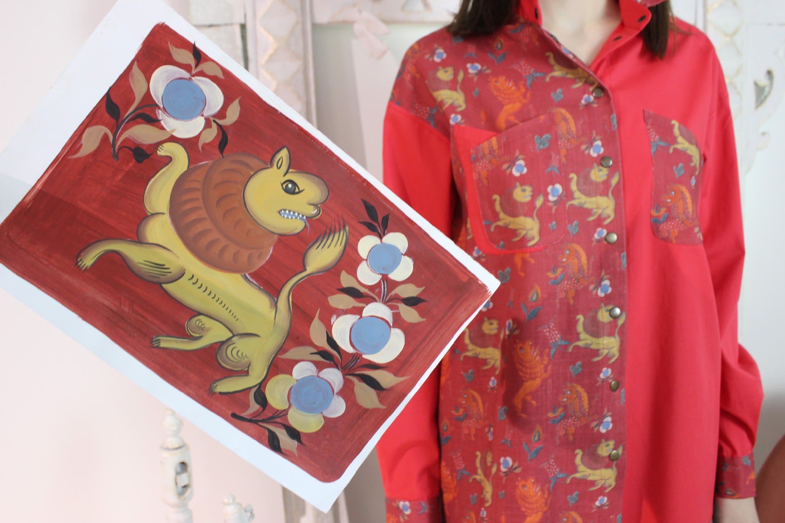 Рубашки и платья коллекции созданы из авторских тканей с мотивами вологодских росписей. В основе — натуральные материалы: конопля, крапива, эвкалипт, хлопок, лён. Их дополняют изящная имитация вологодского кружева, боярские рукава и уникальные принты, которые не встретишь больше нигде.